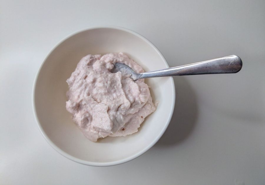 Take a tub of taramasalata and mix it with finely diced red onion.