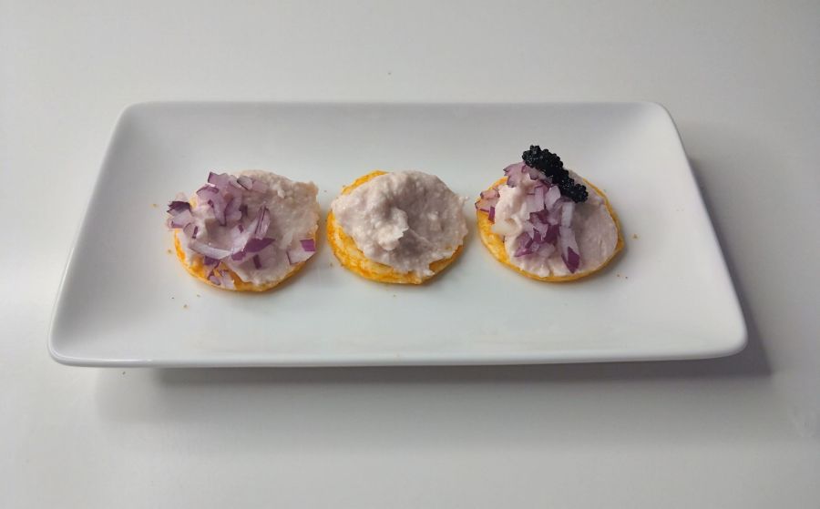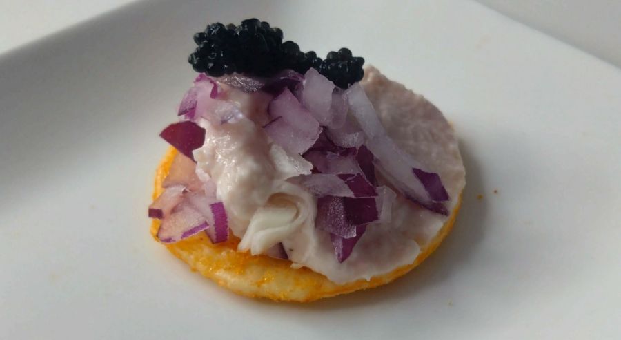 As you can see here, you can also garnish this canapé with additional diced red onion, as well as black lumpfish roe for a striking colour contrast.