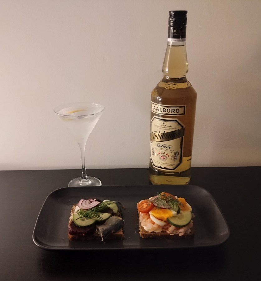 The quality of the drink will be determined by the quality of the akvavit. I was lucky enough to be enjoying a smooth, savoury Aalborg Jubilæum akvavit brought back from Copenhagen.