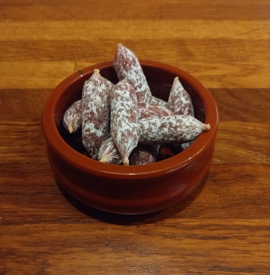 These are miniature pork salamis from the Czech Republic. They’re nice little bites with a tapas feel to them.