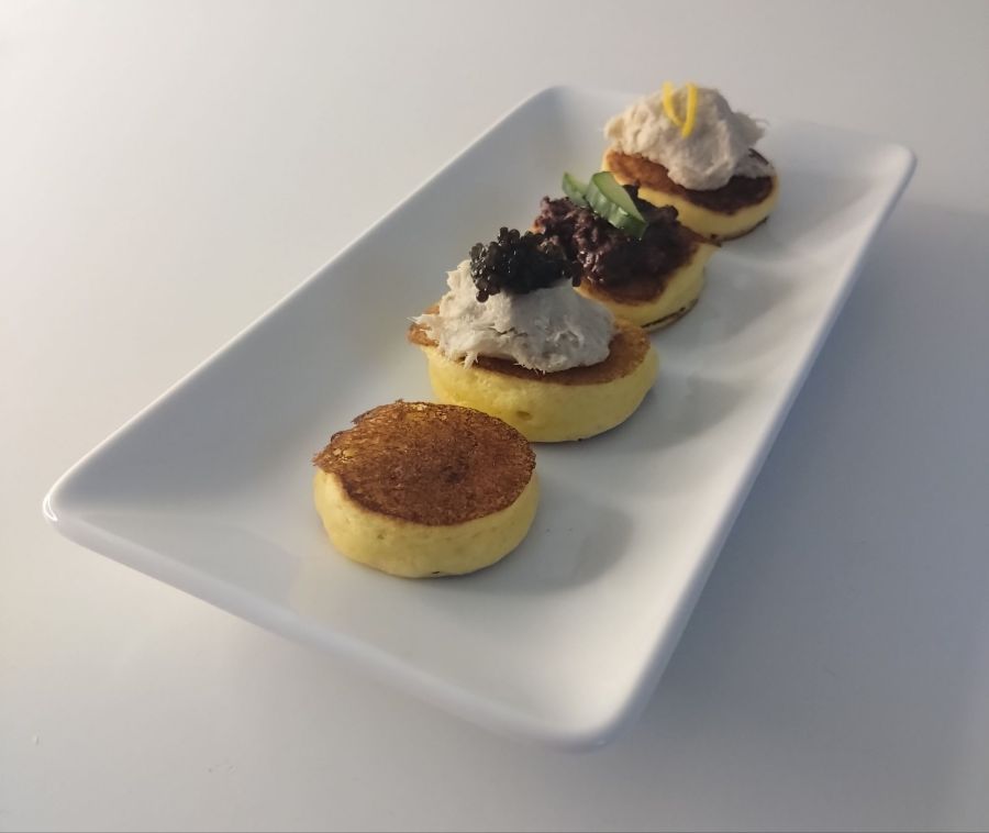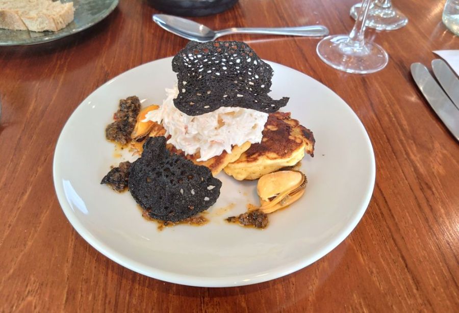 This was a fabulous drop scone dish served with crab, mussels and black tuiles at Ar Bòrd restaurant on the Isle of Mull, but they are more typically served with things like butter and jam.