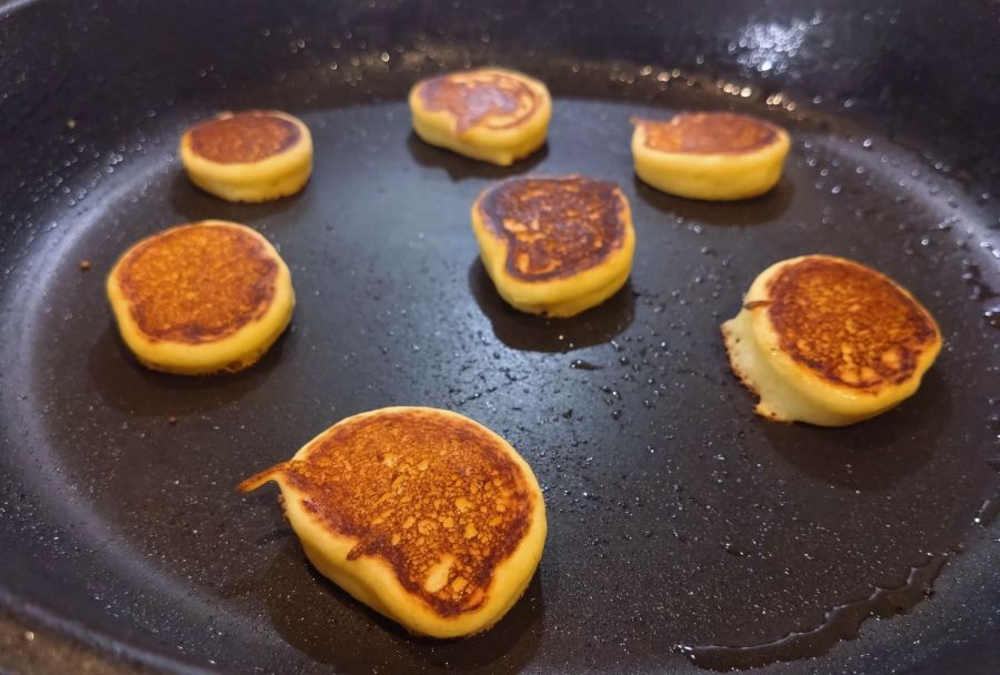 Essentially mix the dry ingredients, then mix the wet ingredients to make a batter. Heat the pan, then add the mixture in small dollops to cook.