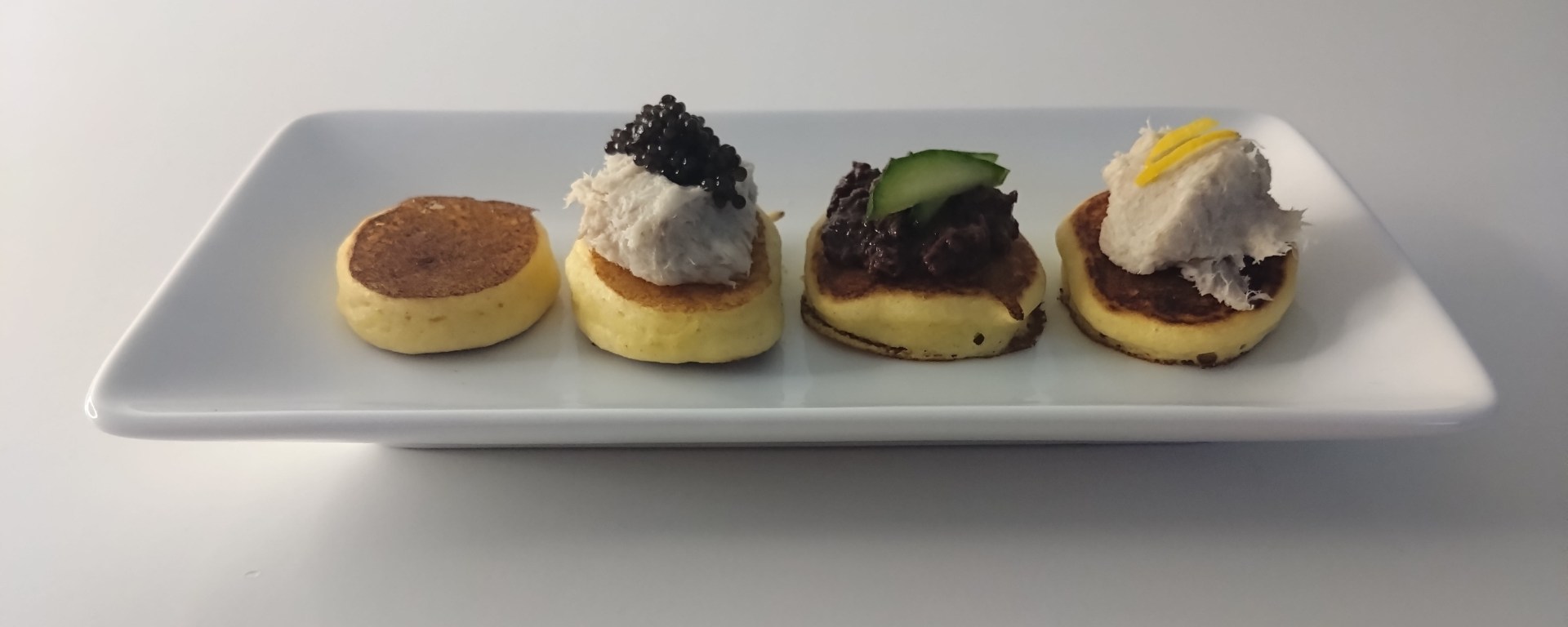 Drop scones are a traditional Scottish dish, soft and fluffy, but I make them smaller than normal for canapés, so they are more comparable to miniature blini. They make a very comforting base for all manner of canapé toppings.