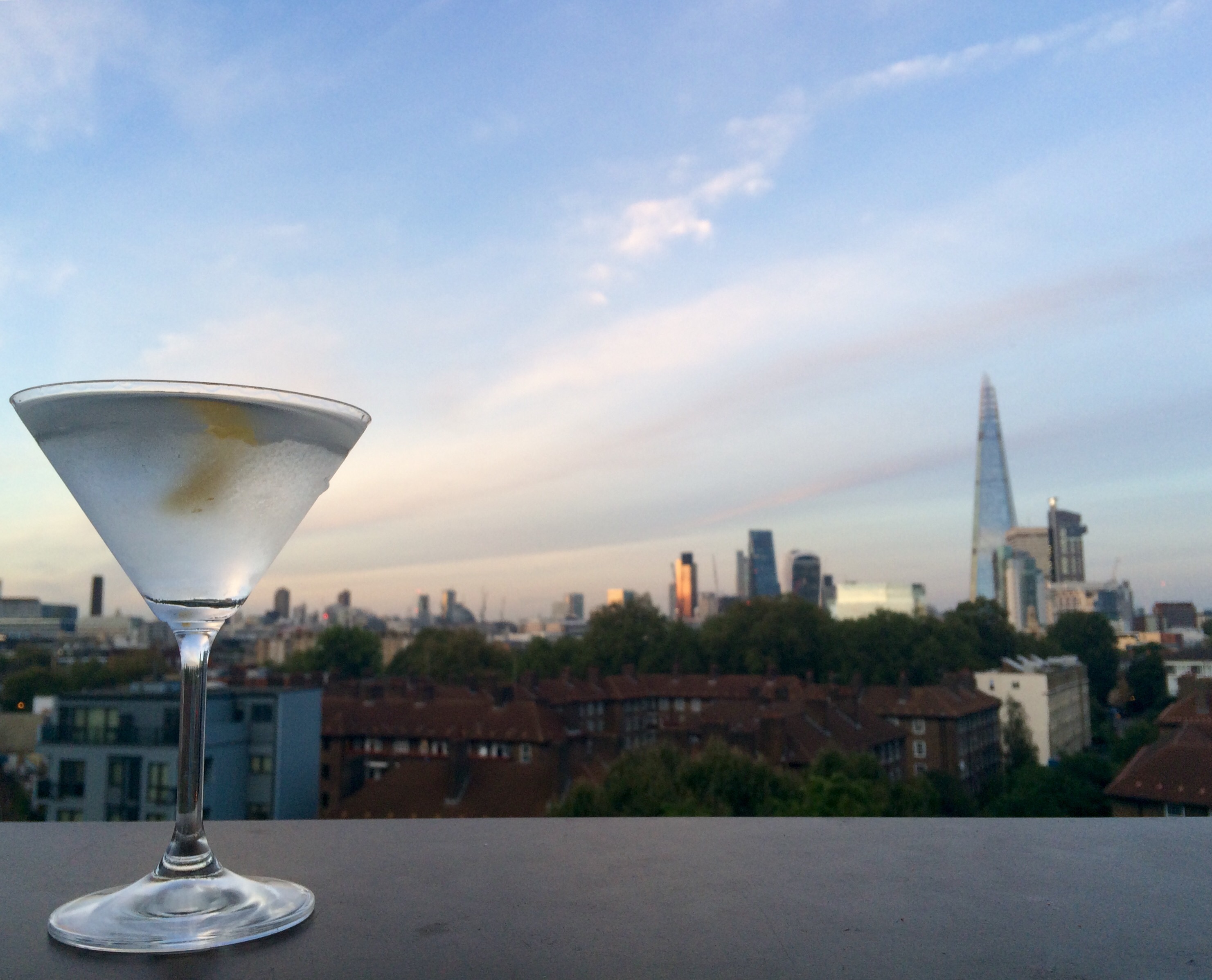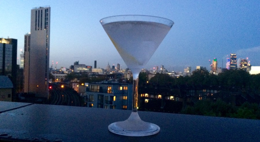 Here is a classic martini with a lemon twist and a sunset overlooking a serene-looking London.
