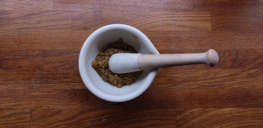 This is very easy. Simply crush the ingredients using a pestle and mortar or a stick blender.