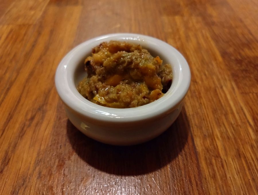 This recipe involved a mixture of pitted Nocellara and Coquillo olives, as well as some slow roasted yellow pepper, cherry tomatoes and a little olive oil. The ingredients came pre-arranged from a deli and could have been served as they were with toothpicks as a form of tapas. Nonetheless, we thought we would turn it into a paste to add to some canapés to go with our drinks.
