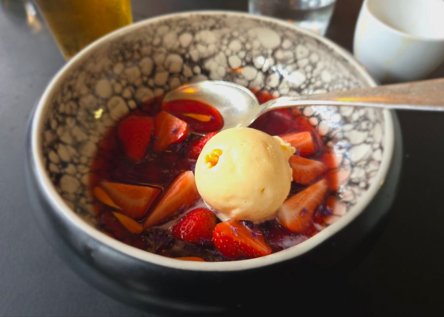 Dessert was a delicious and refreshing cold strawberry “soup” with berries, flowers and a sphere of vanilla ice cream. Sweet and refreshing.