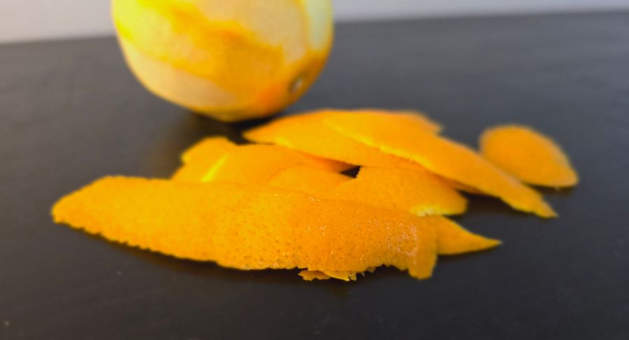 Take a few strips of orange peel to infuse your gin or vodka. As a rough ratio I would recommend the peel of half an orange to around 200ml / 4-8 US fluid ounces of spirit.