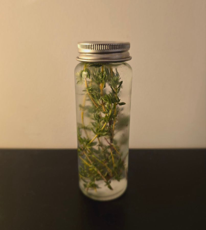 Take a bunch of thyme and add it to a clear jar. Top it up with gin or vodka as well. As a rough ratio I would recommend a couple of sprigs to around 200ml / 4-8 US fluid ounces.