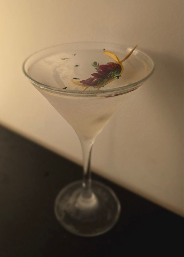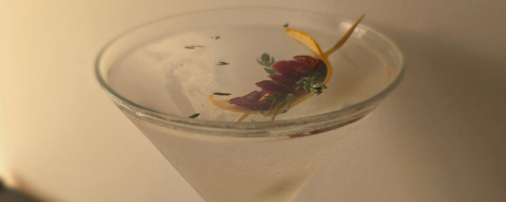 Peel a strip of zest from a fresh orange. Squeeze it gently into a v-shaped glass from the freezer, so you impart the orange oil – much like you would with a strip of lemon peel with a classic martini.