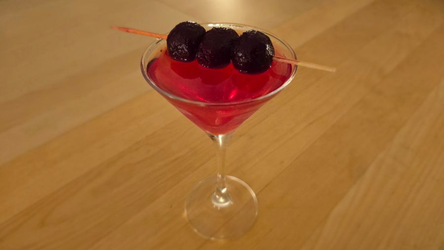 Back at home, this is a Spicy Bethan Jane Martini with pickled beetroot and a splash of Tabasco sauce for a kick.