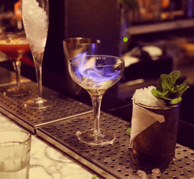 You then light the high proof alcohol, creating a heady aroma in the glass, as well as a bit of visual theatre, without warming up the chilled drink below the spectacle.