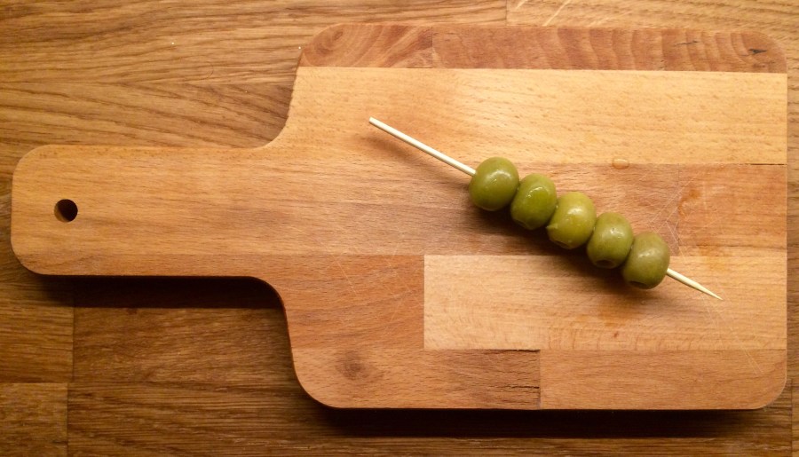 - Stir the drink with your chosen garnish (you might have to thread the olives onto a toothpick before you do this).